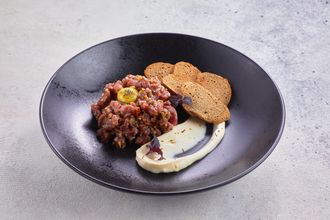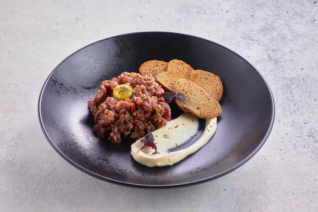 Тартар из говядины (120/20 г.) 590 руб. В корзину Описание Описание Мясо говядины, заправленное соевым и ворчестерским соусом с добавлением каперсом, вяленых томатов, красного лука и корнишонов. Подается с гренками из черного хлеба, перепелиным яйцом и фаршированым айоли.