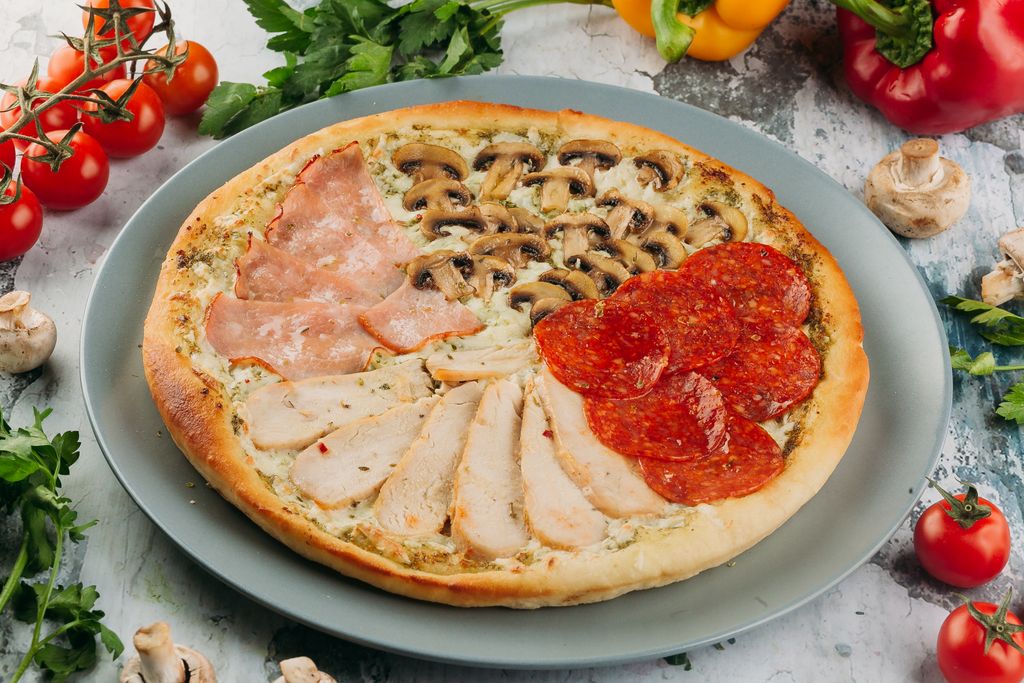 Четыре сезона (650 г.) 780 руб. В корзину Описание Описание Соус песто, сыр моцарелла, карбонат, куриное филе, пепперони, шампиньоны.