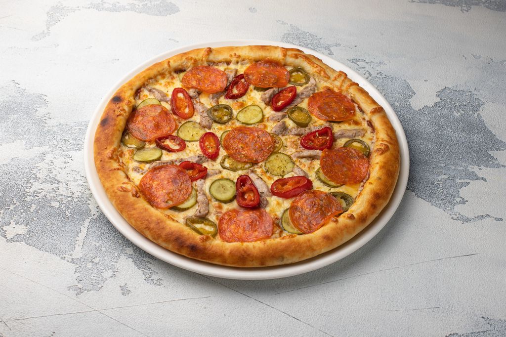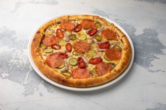МЕКСИКАНСКАЯ (630 г.) 750 руб. В корзину Описание Описание Пицца соус, сыр моцарелла, телятина, колбаски пепперони, острый перец халапенью, маринованные огурцы.