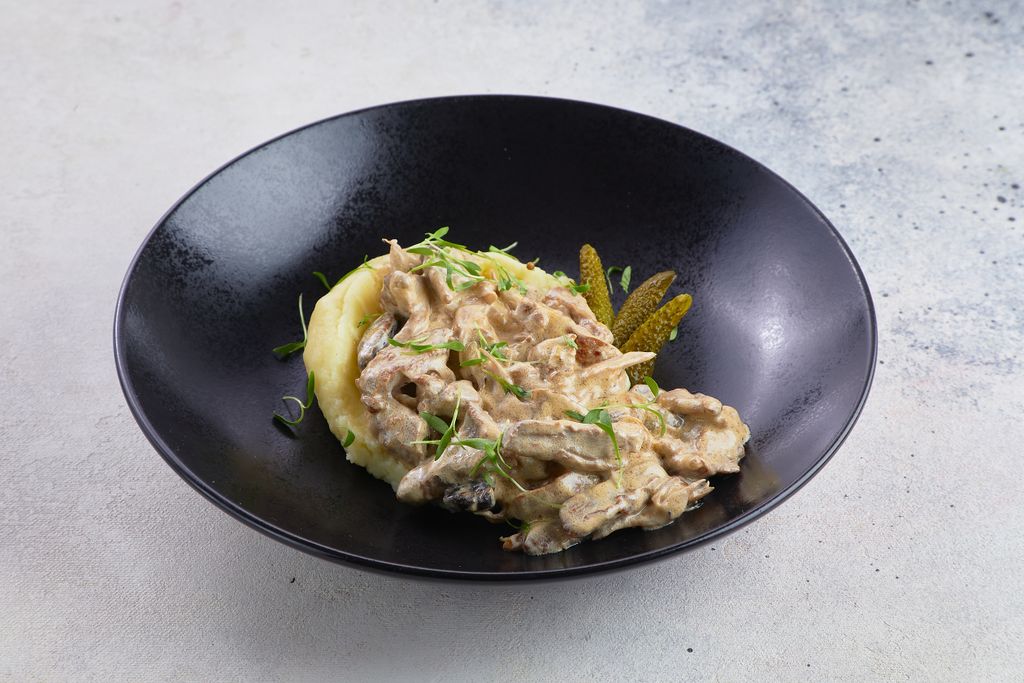 Бефстроганов из говядины (300 г.) 790 руб. В корзину Описание Описание Обжаренные ломтики говядины с грибами и луком в сливочном соусе. Подается с картофельным пюре.