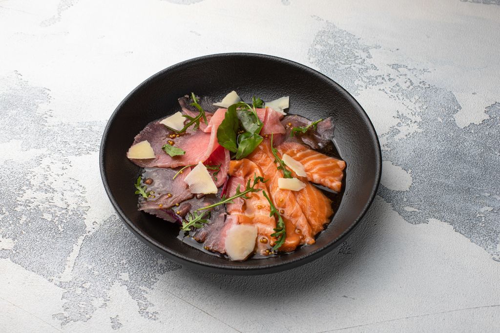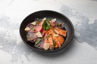 Микс карпаччо лосось-тунец(180г) 790 руб. В корзину Описание Описание Карпаччо лосось, тунец. Подается на подушке микс салата с медово-горчичной заправкой и слайсами Пармезана